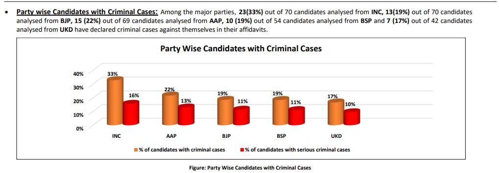 According ADR report nearly 61 candidates in these elections face serious criminal cases. Among the major parties, candidates having criminal cases include Congress where 11 out of 70 candidates belong to this category. The BJP has eight such candidates, AAP has nine candidates while BSP has six. Four out of 42 candidates are from the UKD. There are six candidates with declared cases related to crime against women. Of the six candidates, one candidate has declared case related to person committing rape repeatedly on the same woman (IPC Section- 376(2)(n)). One candidate has declared a case of murder against him while three have cases of attempt to murder against them.