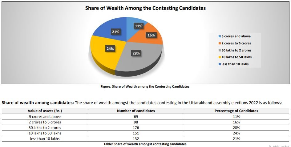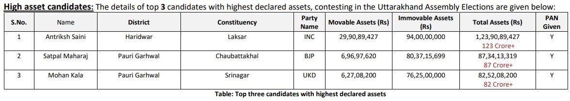 Among the major parties, out of 70 candidates, 60 are from BJP, 56 from Congress, 31 from AAP, 18 out of 54 candidates from BSP and 12 out of 42 candidates analysed from UKD who have declared assets valued more than Rs 1 crore.