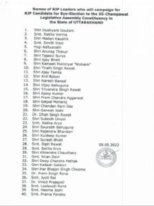 भाजपा ने चंपावत उपचुनाव के लिए की स्टार प्रचारकों की सूची जारी।चंपावत उप चुनाव के लिए भाजपा ने स्टार प्रचारकों की सूची जारी कर दी है। प्रदेश मीडिया प्रभारी मनवीर सिंह चौहान ने जानकारी देते हुए कहा कि केंद्र तथा राज्य से 40 वरिष्ठ नेता भाजपा प्रत्याशी सीएम पुष्कर सिंह धामी के समर्थन में प्रचार के लिये पहुचेंगे शीघ्र ही संगठन स्तर पर कार्यक्रम तय किये जाएँगे।