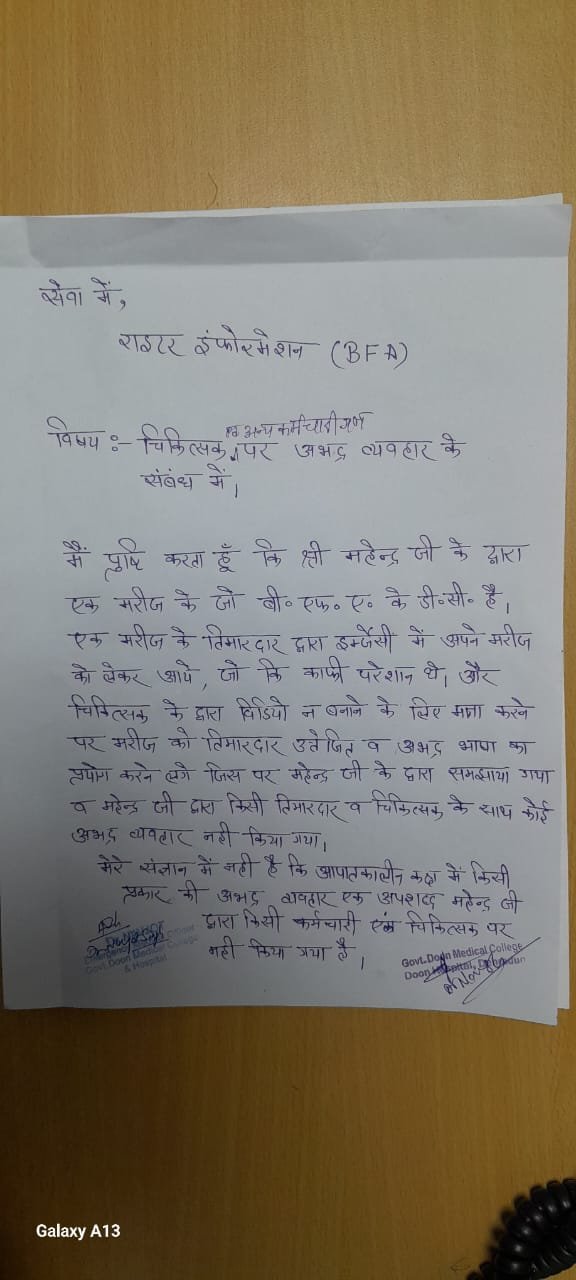 अब क्या है पूरा मामला आपको बताते हैं। दून अस्पताल में 12 अप्रैल 2023 को सविता मित्तल नाम की एक बुजुर्ग जिनकी आयु 72 वर्ष है इलाज के लिए आती हैं लेकिन गंभीर समस्या को देखते हुए दून अस्पताल के डॉक्टरों ने उन्हें बाहर इलाज करवाने के लिए रेफर कर दिया ।लेकिन जब उनके घर वाले उन्हे बाहर अस्पताल मे ले गए तो बाहर डॉक्टरों ने कहा कि आप दून अस्पताल के डॉक्टरों से दोबारा लिखवा कर लाए तभी हम इलाज कर पाएंगे। इसी के तहत मरीज सविता मित्तल के घरवाले सविता मित्तल को लेकर 15 अप्रैल को दुबारा दून अस्पताल लेकर आए लेकिन सविता मित्तल इस कंडीशन में नहीं थी कि वह चलकर दून अस्पताल के अंदर आ सके उनकी कंडीशन को देखते हुए सविता मित्तल के घर वालों ने उस दिन मौजूद डॉक्टर आमिर से निवेदन किया कि वह सविता मित्तल को बाहर गाड़ी के अंदर ही देख ले बताया जा रहा है कि डॉक्टर आमिर ने मरीज़ को बाहर जाकर गाड़ी मे देखने से मना कर दिया जिस कारण डॉक्टर आमिर और सविता मित्तल के घर वालों में विवाद हो गया। इसी बीच महेंद्र प्रसाद भी वहां पहुंचे और उन्होंने डॉ आमिर से इंसानियत के नाते रिक्वेस्ट की कि वह मरीज को बाहर गाड़ी मे देख ले लेकिन डॉक्टर आमिर ने सीनियर अधिकारियों का हवाला देते हुए मरीज को गाड़ी में देखने से मना कर दिया। जब यह हंगामा चल रहा था इसी दौरान वहां सिनियर डॉ नरेश भी पहुंचे और उन्होंने मरीज के घरवालों को शांत कराया और यही मामला खत्म हो गया।