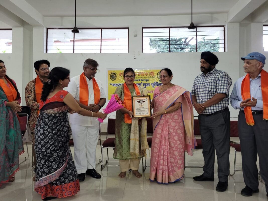 देहरादून। संस्कार भारती महानगर इकाई द्वारा गुरु पूर्णिमा नटराज पूजन उत्सव कला साधक सम्मान का आयोजन देहरादून के जीएमएस रोड स्थित श्री कमलेश्वर महादेव शिव मंदिर में आयोजित किया गया। जिसमें मुख्य अतिथि के रूप में सुनील कुमार प्रिंसिपल केंद्रीय विद्यालय आइटीबीपी, अति विशिष्ट अतिथि के रूप में श्रीमती सविता कपूर विधायक कैंट विधानसभा देहरादून ,श्री श्याम कार्तिक मिश्रा कथक नर्तक आदि मौजूद रहे।