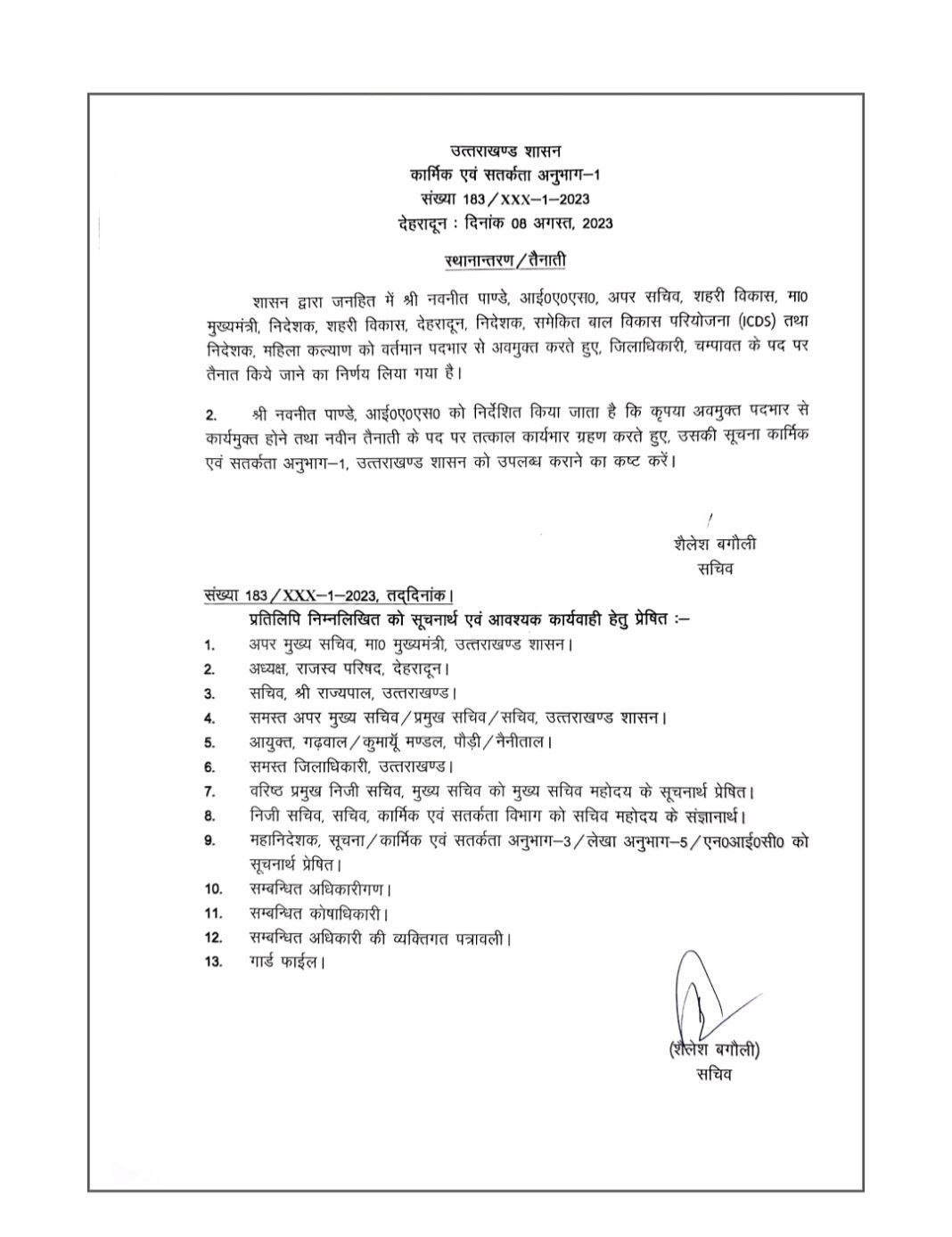 देहरादून । उत्तराखंड में धामी सरकार ने शासन में बड़ा फेरबदल करते हुए दो आईएएस अधिकारी और 50 पीसीएस अधिकारियों का तबादला कर दिया है इस संबंध में आदेश भी जारी कर दिए गए हैं । शासन में अपर सचिव शहरी विकास पद पर तैनात नवनीत पांडेय (Navneet Pandey) को चंपावत का जिलाधिकारी बनाया गया है। जिन जिन अधिकारियो के तबादले हुए हैं वो निम्नवत हैं: