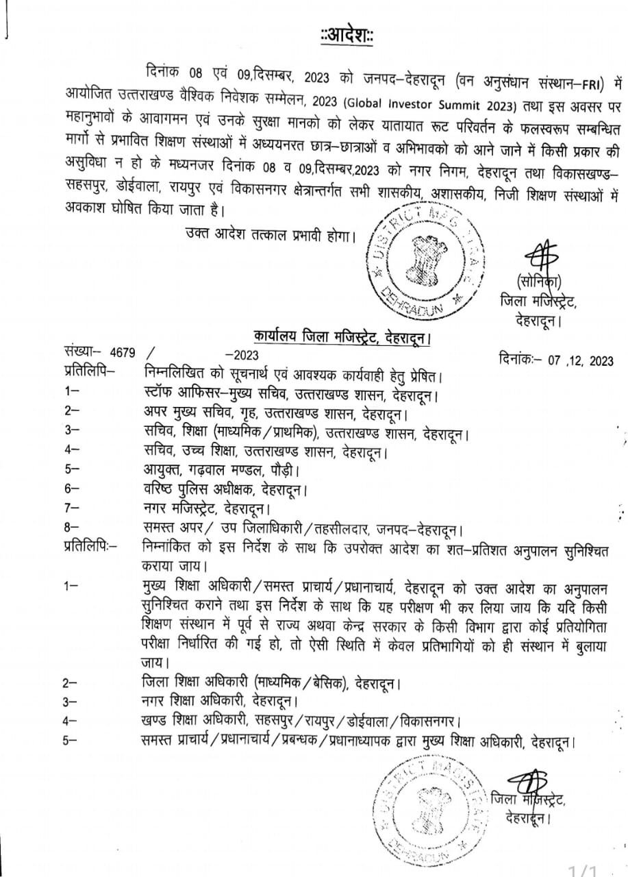 देहरादून । वन अनुसंधान संस्थान-FRI में 8 एवं 9 दिसंबर को आयोजित हो रहे,उत्तराखण्ड वैश्विक निवेशक सम्मेलन, 2023 के अवसर पर बाहर से आ रहे मेहमानों के आवागमन एवं उनकी सुरक्षा को देखते हुए यातायात रूट परिवर्तन किया गया है और सम्बन्धित मार्गो से प्रभावित शिक्षण संस्थाओं में अध्ययनरत छात्र-छात्राओं व अभिभावको को आने जाने में किसी प्रकार की असुविधा न हो, इसके लिए 08 व 09, दिसम्बर, 2023 को नगर निगम, देहरादून तथा विकासखण्ड- सहसपुर, डोईवाला, रायपुर एवं विकासनगर क्षेत्रान्तर्गत सभी शासकीय, अशासकीय, निजी शिक्षण संस्थाओं में अवकाश घोषित किया गया है। इसके आदेश देहरादून डीएम सोनिका ने जारी किए हैं।